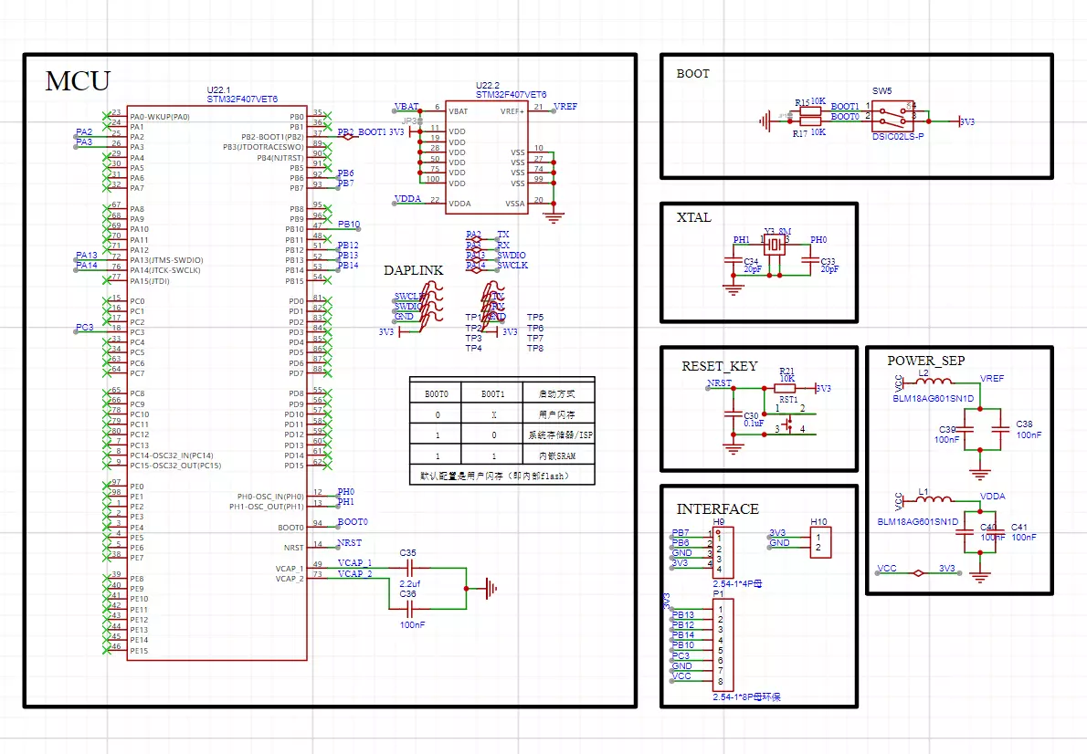 - 经过一个LDO稳到3.3V给MCU整体供电,VDDA和VCC用磁珠滤波隔离了一下