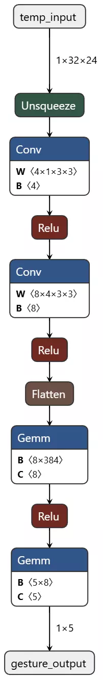 - 分类器层:将特征展平后,经过一个8维的线性层(含ReLU),最终输出5类概率。总参数量约3KB,RAM占用<8KB