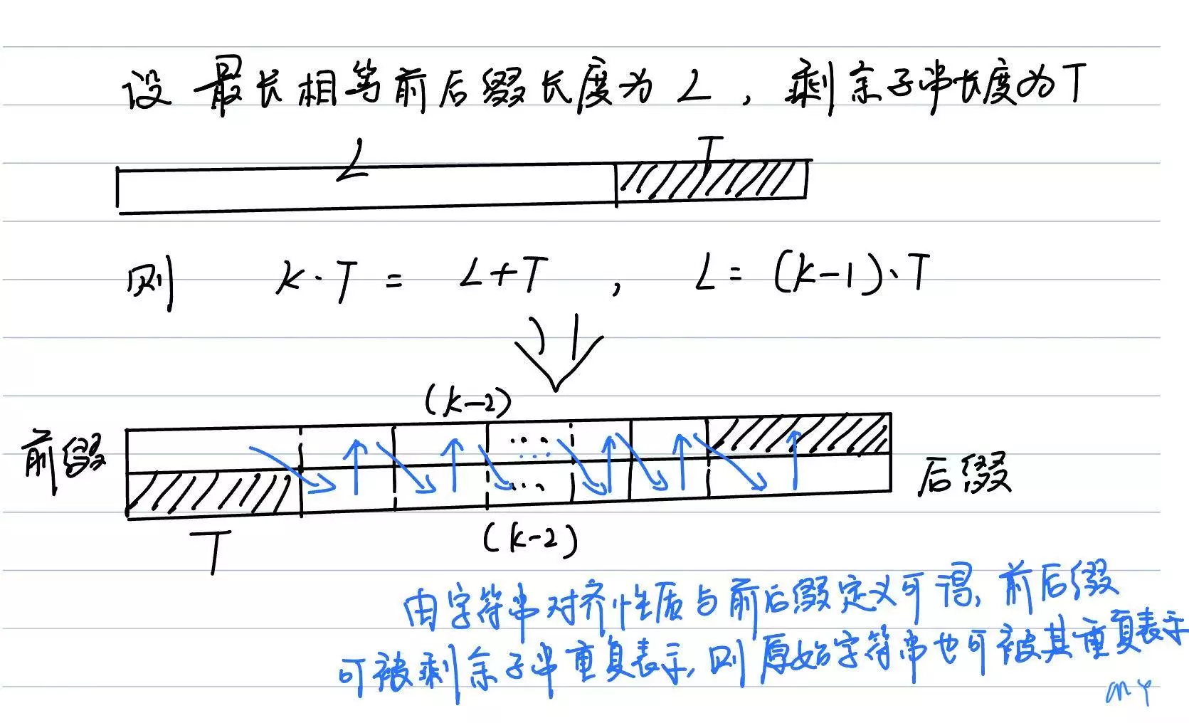 必要性证明,即如果字符串能被某个子串重复表示,则去掉字符串的最长相等前后缀后的剩余子串长度必能整除原始长度。
